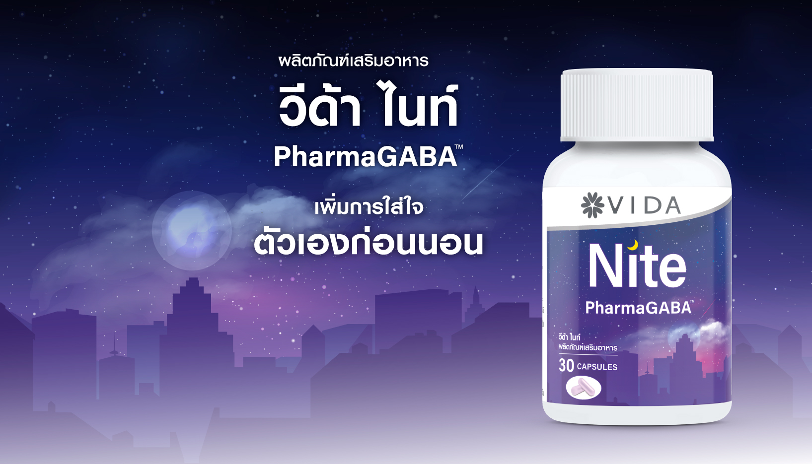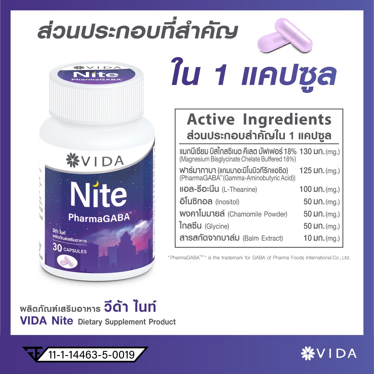 เพิ่มการใส่ใจตัวเองก่อนเข้านอนด้วย Vida Nite วีด้า ไนท์ มีส่วนประกอบหลักจาก PharmaGABA กาบ้าธรรมชาติจากญี่ปุ่น และ แมกนีเซียม บิสไกลซิเนต จากอเมริกา ซึ่งเป็นรูปแบบที่ดูดซึมได้ดี เสริมด้วย แอล-ธีอะนีน อินโนซิทอล คาร์โมมายด์ แอล-ไกลซีน และสารสกัดจากบาล์ม
