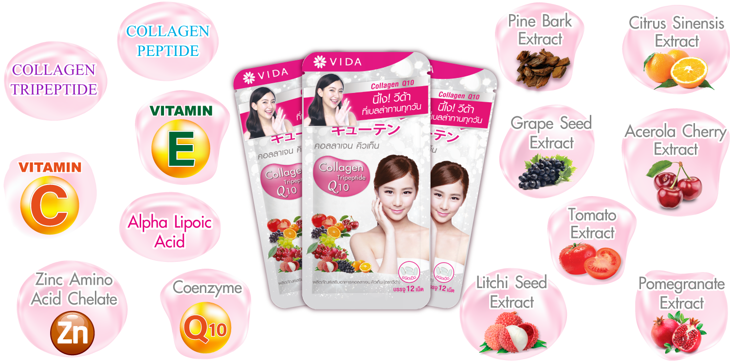 Vida Collagen Q10 อาหารเสริมในรูปแบบเม็ด ที่มีส่วนประกอบหลักจาก คอลลาเจนไตรเปปไทด์,